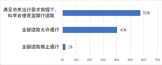 據(jù)調(diào)查,約58%的市民支持在滿足市民出行需求前提下,科學(xué)合理設(shè)置禁行道路;40%的市民認(rèn)為應(yīng)該全部道路允許電動(dòng)二輪車(chē)通行;僅2%的市民認(rèn)為電動(dòng)二輪車(chē)應(yīng)當(dāng)在全部道路禁止通行。