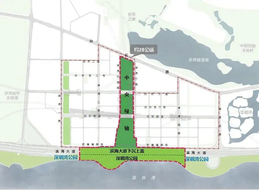 ▲深圳灣超級總部基地中央綠軸設(shè)計范圍示意圖