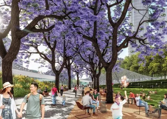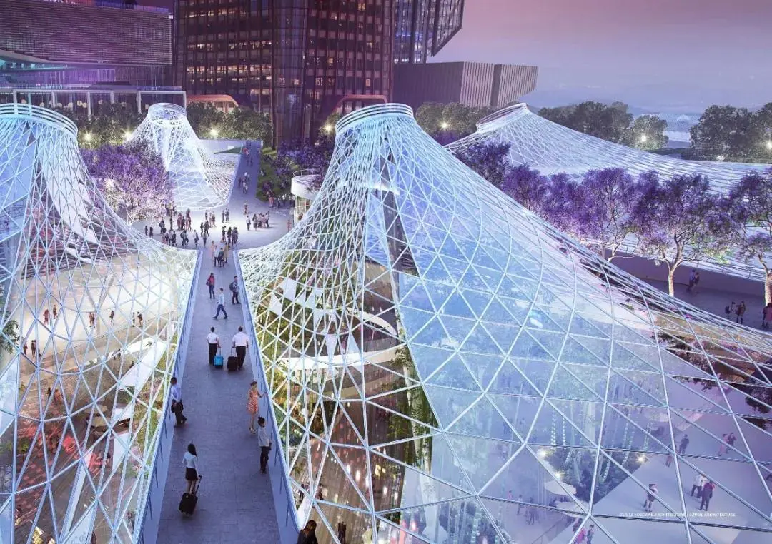 為車站廣場,“水晶山丘”屋面覆蓋著地下車站樞紐大廳,同時也在地面創(chuàng)造出造型獨特的城市地標。光影和夜景效果與交叉的藍花楹大道配合,打造一個極具設(shè)計感的交通集散空間。地下共享大廳、地下森林與地面廣場、周邊建筑建立視覺聯(lián)系,成為中央綠軸美景的一部分。