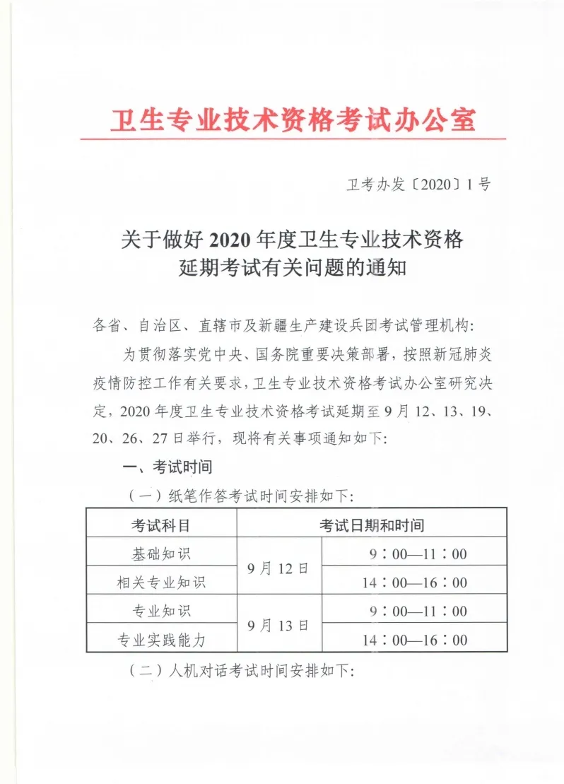 6月1日,衛(wèi)生專業(yè)技術資格考試辦公室印發(fā)《關于做好2020年度衛(wèi)生專業(yè)技術資格延期考試有關問題的通知》,2020年度衛(wèi)生專業(yè)技術資格考試延期至9月12、13、19、20、26、27日舉行。