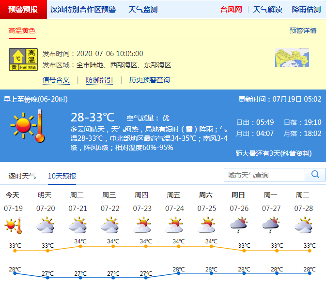 見(jiàn)圳客戶(hù)端·深圳新聞網(wǎng)2020年7月19日訊 深圳市氣象臺(tái)預(yù)計(jì),19-20日我市多云間晴天,局地有短時(shí)(雷)陣雨,氣溫28℃-33℃,中北部最高氣溫34℃-35℃;21-25日晴天到多云,局部偶有短時(shí)(雷)陣雨,悶熱加劇。
