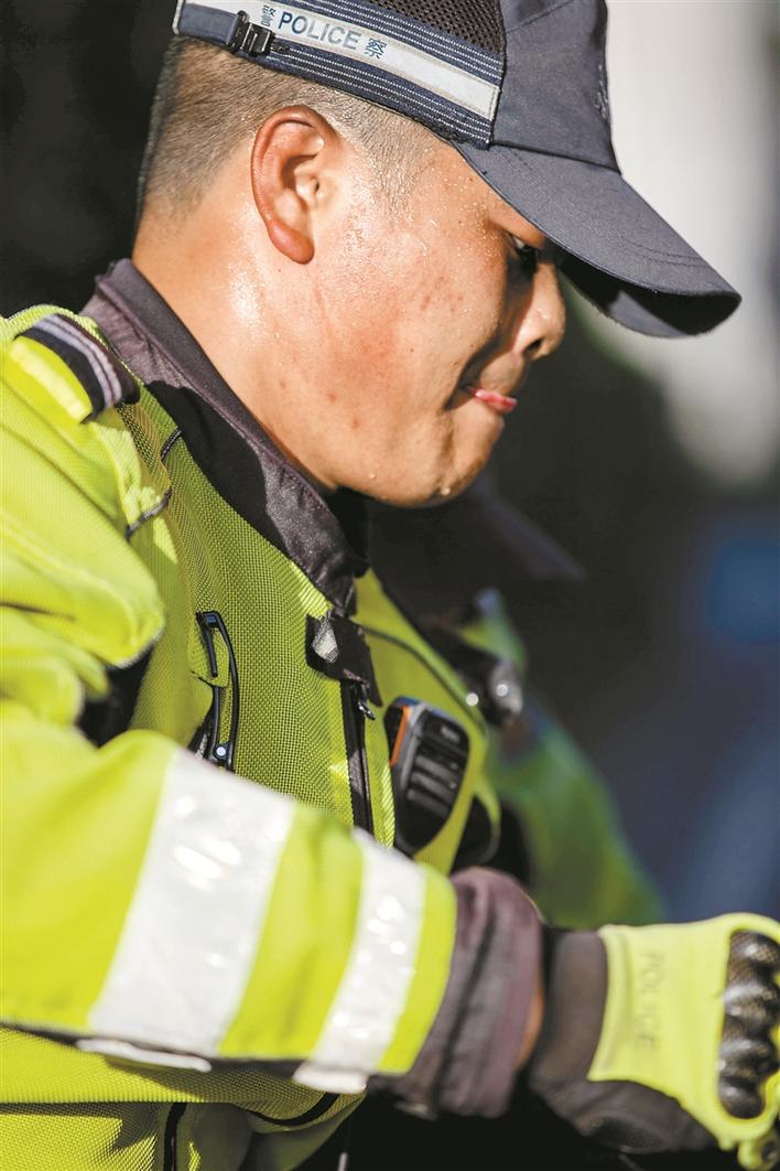 “深圳最近的天氣太熱了,到了中午,地面溫度估計(jì)得有40℃了,我們因?yàn)榇髦谡?,外頭還得加上頭盔,感覺確實(shí)挺難受的?!鄙钲诮痪仙酱箨?duì)機(jī)訓(xùn)中隊(duì)的鐵騎小哥時云財(cái),每天早高峰開始就駕駛鐵騎穿梭在大街小巷,直到中午太陽最盛的時候。摘下頭盔,眼睫毛上都是汗滴,更不用說脫下熒光黃的制服,里面是層層疊疊早已被浸透發(fā)白的衣衫。