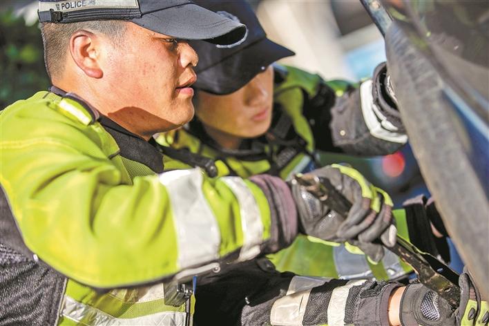時云財(cái)和同事馬上幫助陳先生從車后備箱拿出換胎工具和備胎,在保證安全的前提下,僅用10分鐘就更換好輪胎?!疤兄x你們了,深圳交警‘小黃人’真的是我們最信任的人,有你們在我覺得上路開車就很放心。”陳先生不住地感謝、稱贊交警鐵騎小哥。