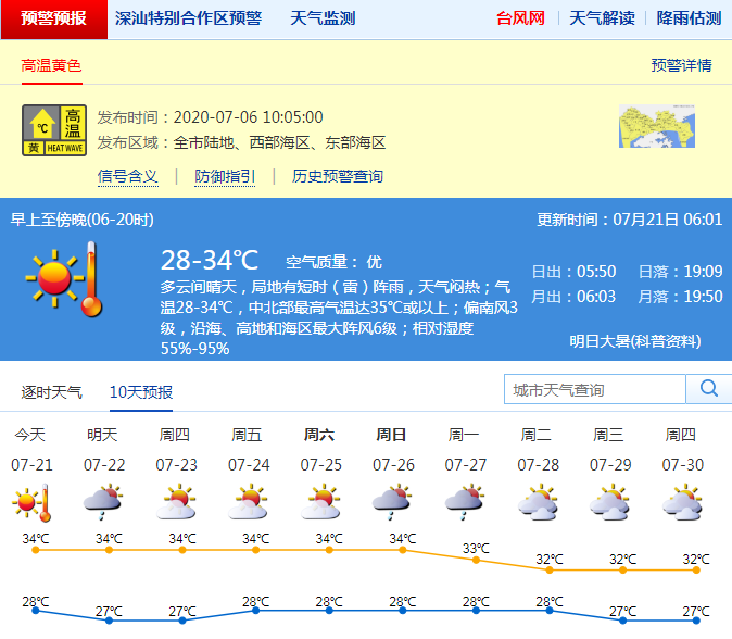 見圳客戶端·深圳新聞網(wǎng)2020年7月21日訊 今日多云間晴天,局地短時雷陣雨;氣溫28-34℃,中北部可達35℃以上;偏南風3級,沿海、高地和海區(qū)最大陣風6級;濕度55%-95%。22日晴天間多云,局地短時陣雨。23-27日,天氣悶熱,局地短時陣雨。深圳市氣象臺20日16時發(fā)布