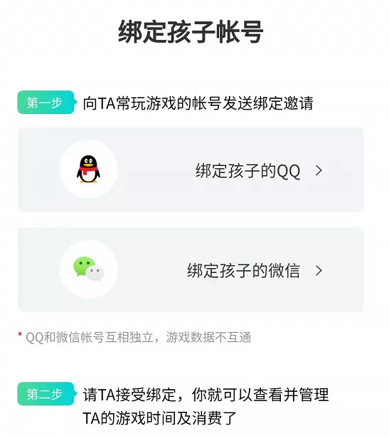 進(jìn)入系統(tǒng)后,可以選擇你是家長還是孩子,比如選擇家長后,可以選擇孩子是用你的賬號玩還是他自己的賬號,如果是他自己的賬號,就可以向他常玩的賬號發(fā)送綁定申請,這里同時支持微信和QQ。