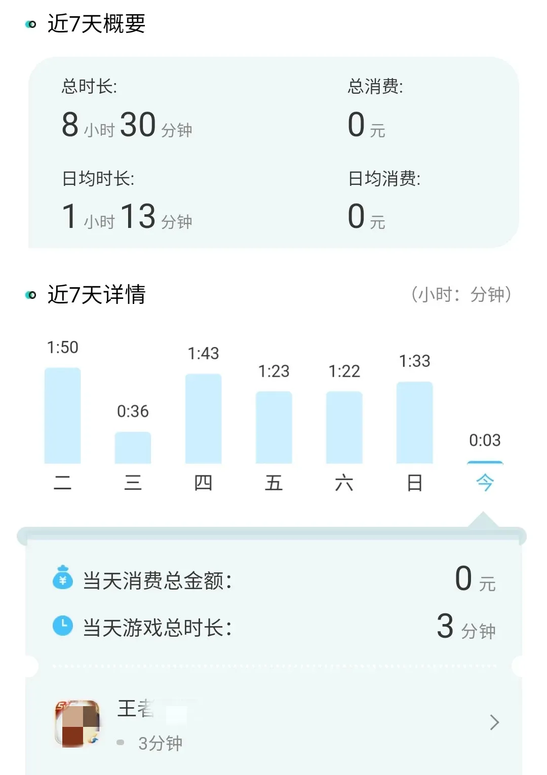 點(diǎn)擊進(jìn)入詳情頁,甚至還能看到最近7天的統(tǒng)計(jì)情況,總共玩多長時(shí)間,每天玩多長時(shí)間,每次登陸哪款游戲,登錄了多久,什么時(shí)候退出游戲……