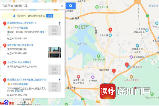 28日上午,記者通過登錄深圳圖書館街區(qū)自助圖書館查詢發(fā)現(xiàn),目前寶安區(qū)可以預借取書的公共服務(wù)點共有25個,其中石巖街道無服務(wù)點。而通過百度搜索,之前設(shè)置的石巖艾美特廠服務(wù)點和同富康工業(yè)區(qū)服務(wù)點顯示暫停開放。