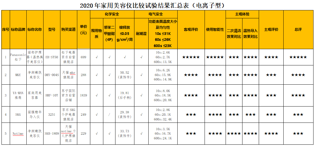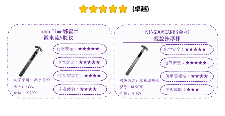 經(jīng)測試,綜合化學(xué)安全、電氣安全、使用智能性、主觀體驗等消費者關(guān)心的多個維度,2款微電流型家用美容儀和1款電離子型美容儀品質(zhì)領(lǐng)跑表現(xiàn)卓越,分別為,國產(chǎn)品牌nanoTime娜蜜絲F83L微電流V臉儀和KINGDOMCARES金稻 KD9070瘦臉按摩棒;日本品牌Panasonic松下 EH-ST50面部護(hù)理器(溫?zé)犭x子美容儀)。