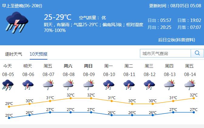 見圳客戶端·深圳新聞網(wǎng)2020年8月5日訊 今日我市陰天,有暴雨;氣溫25-29℃;偏南風(fēng)3級;相對濕度70%-100%。深圳市氣象臺于2020年8月5日5時15分在全市發(fā)布雷電預(yù)警,今天上午海上將不斷有降雨云團(tuán)生成,受其影響我市有零散雷暴;未來6小時累計雨量將達(dá)暴雨,深圳市氣象臺于2020年8月5日5時40分在全市發(fā)布暴雨黃色預(yù)警,全市進(jìn)入暴雨戒備狀態(tài),需注意防范。市民停留在安全地方;按照防御預(yù)案停止戶外易燃易爆危險作業(yè),并加強?;瘓鏊踩芾?。