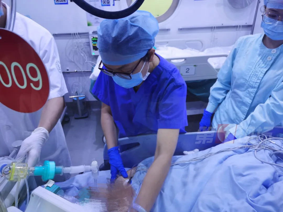 當(dāng)時人是神智不清的,有頻繁的抽搐,考慮這個頻繁抽搐,還是跟她心跳驟停之后,大腦缺血、缺氧狀態(tài)有關(guān)系。我們樓下?lián)尵仁遥芸炀徒o她一個評估全身的狀態(tài),再一個就是第一時間,我們就給她緊急安排了高壓氧的治療。