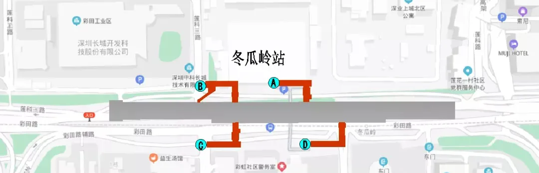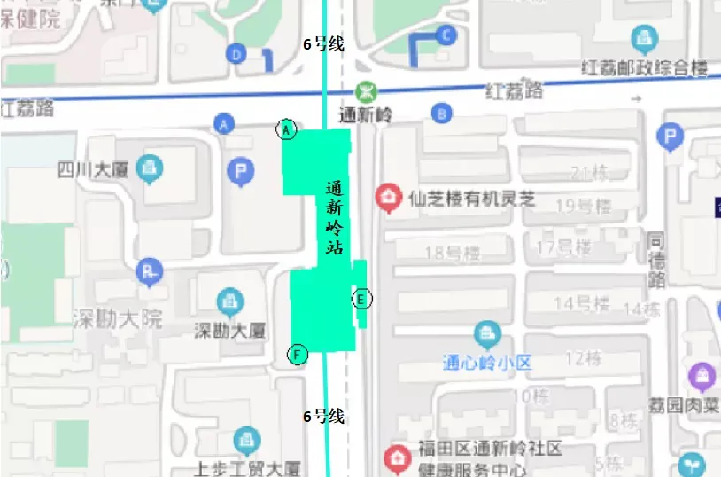 其中,A口位紅荔路,靠近四川大廈;E口位于上步路東側,靠近通新嶺小區(qū);F口位于上步路西側,靠近深勘大廈。