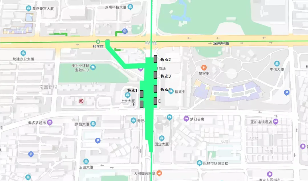 其中,E口位于上步路東側并朝向南園路;物業(yè)1口位于物業(yè)層,靠近上步大廈;物業(yè)2口、物業(yè)3口位于物業(yè)層,靠近平安銀行;F口位于上步路西側并朝向南園路;物業(yè)4口位于物業(yè)層,靠近佳兆業(yè)大廈。