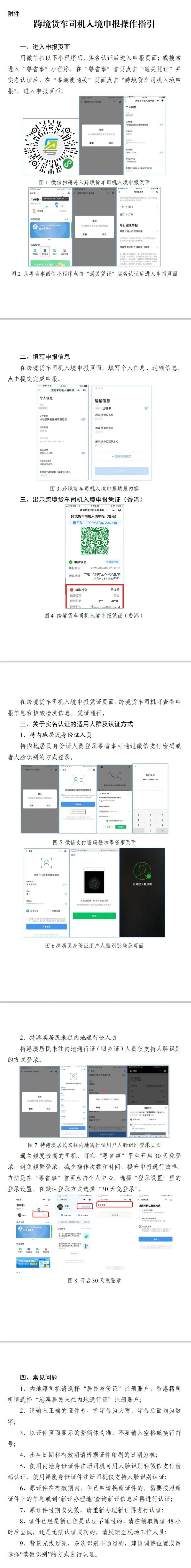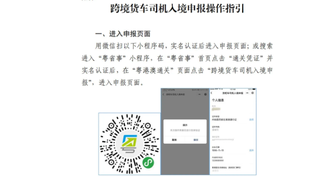 一、跨境司機(jī)入境前應(yīng)在“粵省事”微信小程序(粵省事—粵康碼—粵港澳通關(guān)—跨境貨車司機(jī)入境申報)中準(zhǔn)確申報運(yùn)輸作業(yè)任務(wù)相關(guān)信息,包括作業(yè)目的地詳細(xì)信息(工廠/倉庫名稱及所在街道)、內(nèi)地手機(jī)號碼及相關(guān)個人信息,相關(guān)操作指引詳見附件。入境后所申報手機(jī)號碼將會接收提醒短信。未安裝GPS定位系統(tǒng)和ETC電子不停車收費(fèi)系統(tǒng)的入境貨車,需按照相關(guān)部門安排前往指定場地免費(fèi)安裝GPS和ETC系統(tǒng)。
