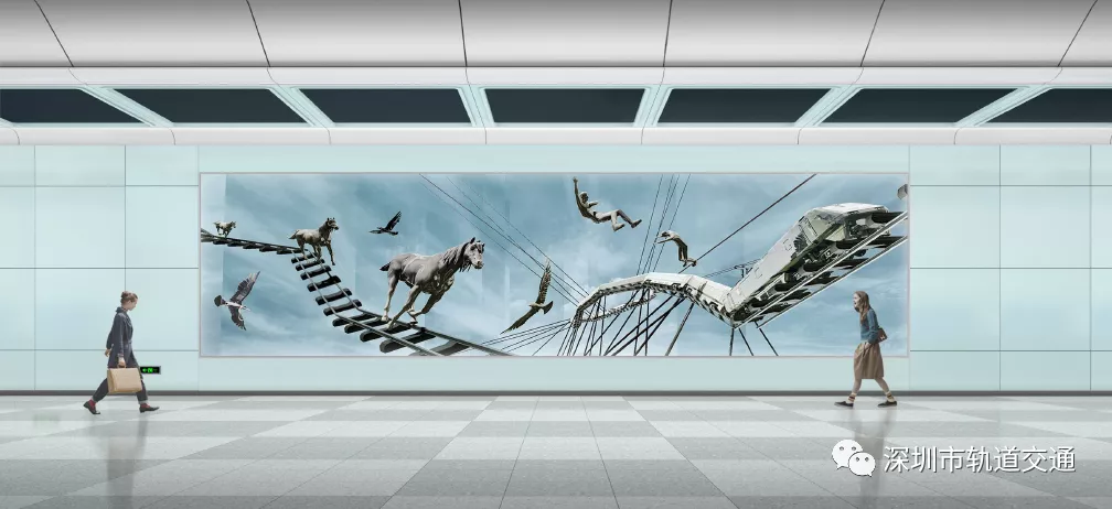 該站文化藝術(shù)墻以瓷板為材質(zhì),通過(guò)火車(chē)軌道、雄鷹、馬等元素結(jié)合,呈現(xiàn)出現(xiàn)代城市的多種元素,將城市、生態(tài)和科技的完美結(jié)合。