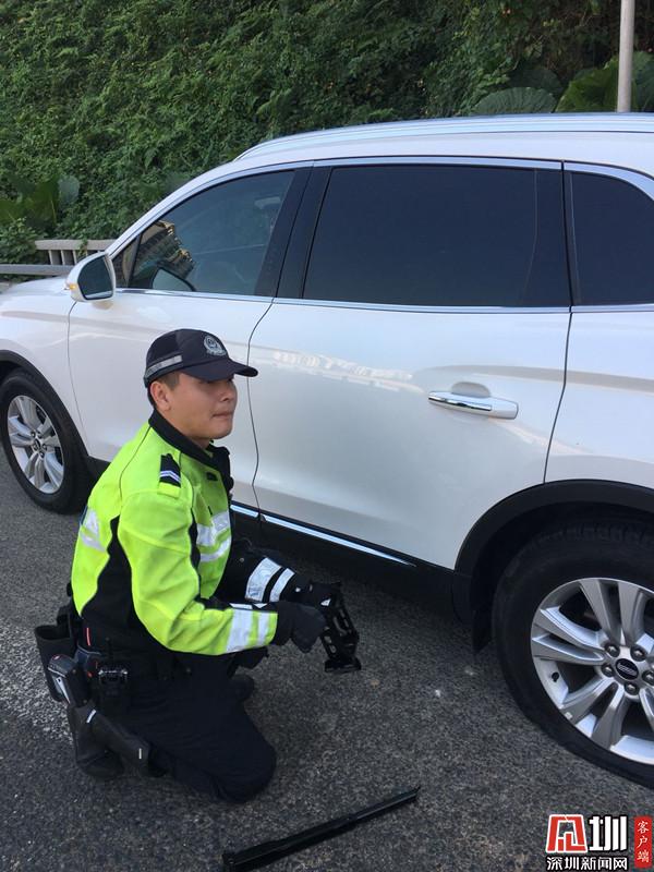 事情發(fā)生在10月11日早上10時(shí)30分許,劉先生駕車出外辦事,車輛行駛至東環(huán)高架西往東方向時(shí),突然一聲巨響左后輪輪胎爆裂車輛半路拋錨,當(dāng)時(shí)正值交通早高峰,過往車輛不斷,故障車輛停在道路中間導(dǎo)致路段交通擁堵,車主劉先生一時(shí)間不知所措,只能留在原地等待救援。此時(shí)正在執(zhí)行巡邏任務(wù)的羅湖交警鐵騎組長(zhǎng)陳展廷見狀,立即停下警車上前查看情況,了解情況后,為了緩解該路段的交通擁堵,防止出現(xiàn)交通意外,陳展廷立即讓劉先生把車停靠在最右側(cè)車道,然后安排隊(duì)員用警車在故障車輛周邊設(shè)置出了安全警戒區(qū)域,另一位隊(duì)員則對(duì)過往車輛進(jìn)行指揮疏導(dǎo)及勸慰駕駛?cè)瞬灰?,在安全區(qū)域等待,陳展廷則俯下身為爆胎車輛更換輪胎。約15分鐘的忙碌后,三位鐵騎隊(duì)員已滿身是汗,但在他們的密切協(xié)調(diào)配合下,快速幫助駕駛?cè)藙⑾壬鷶[脫困境,險(xiǎn)情在最短時(shí)間內(nèi)被及時(shí)排除,道路交通秩序也恢復(fù)正常,這暖心一幕讓劉先生很是感動(dòng),緊緊握著陳展廷同志的手連聲表示感謝。