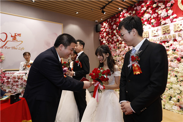 見圳客戶端·深圳新聞網(wǎng)12月12日訊(記者 李慧 通訊員 黎少忠 黃穎怡)“1212,要愛要愛!我們結婚啦!”,“雙十二”對大部分人來說是一個購物的好日子,但對打算步入婚姻的新人們來說,卻是一個不可錯過的登記好時機。12月12日,羅湖區(qū)婚姻登記處四處洋溢著歡樂的笑聲,12對新人在滿是玫瑰花的婚姻登記處中舉行集體結婚儀式。據(jù)悉,這也是疫情以來羅湖區(qū)首場結婚登記集體頒證儀式。