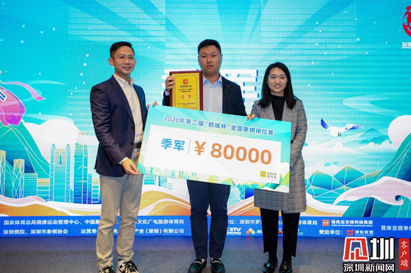 薛江與舒立共同為趙鑫鑫頒發(fā)獎(jiǎng)牌與賽事獎(jiǎng)金。趙鑫鑫在發(fā)表賽后感言時(shí)說道,今年疫情的大背景下賽事少,“鵬城杯”辦得非常好。他也表示,在一年的最后一天下棋對(duì)弈非常難得,希望明年再進(jìn)一步。