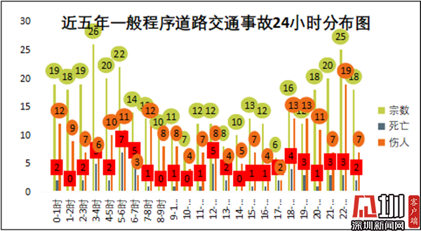 羅湖交警通過(guò)研判分析近5年的事故,發(fā)現(xiàn)凌晨5時(shí)至7時(shí),是亡人事故的高發(fā)的時(shí)段之一;凌晨3至6時(shí)、夜間21至22時(shí)是一般程序道路交通事故高發(fā)時(shí)段,分別發(fā)生事故68宗和45宗、占總數(shù)的18.84%和12.47%。其中凌晨的5時(shí)至7時(shí)是亡人事故的高發(fā)時(shí)段之一,占總亡人事故的22.64%。