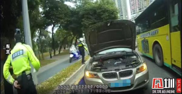 見圳客戶端·深圳新聞網(wǎng)1月21日訊(記者 郭含笑 通訊員 黃佳佳 陳慧琪)1月19日晚,羅湖交警筍崗中隊(duì)鐵騎隊(duì)員彭鉞崴、陳培斌巡邏至深圳市羅湖區(qū)泥崗路輔道轉(zhuǎn)北環(huán)大道路段時(shí),發(fā)現(xiàn)一輛煙霧彌漫著的小車突發(fā)故障,停放在路邊。站在一旁的車主神情十分慌亂,兩名鐵騎隊(duì)員立即上前了解情況,經(jīng)與該車女車主溝通,車輛水箱爆開防凍冷卻液外滲,導(dǎo)致無(wú)法正常行駛,被迫停放在此處。