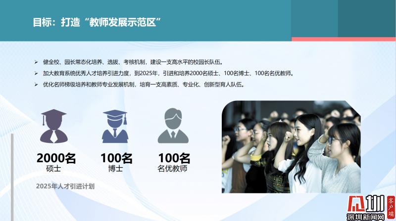 在人才隊伍方面,實施“領鷹工程”,建設一支高水平的校園長隊伍。優(yōu)化名師梯級培養(yǎng)和教師專業(yè)發(fā)展機制,培育一支高素質、專業(yè)化、創(chuàng)新型育人隊伍。到2025年,羅湖將引進和培養(yǎng)2000名碩士、100名博士、100名名優(yōu)教師,建立教科研博士工作站。