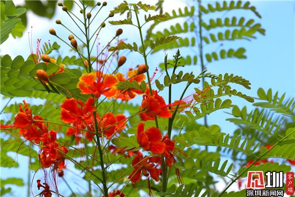 五月綻放全城的鳳凰花,映射著深圳這座城市的繁華與熱情,同時(shí)也給這座城市帶來勇敢熱烈的色彩。從鏡頭中可見,鳳凰花花團(tuán)緊簇,在藍(lán)天的襯托下,那一簇簇火紅的花海張揚(yáng)而又高調(diào)地綻放,為深圳“藍(lán)”染上了一抹紅。