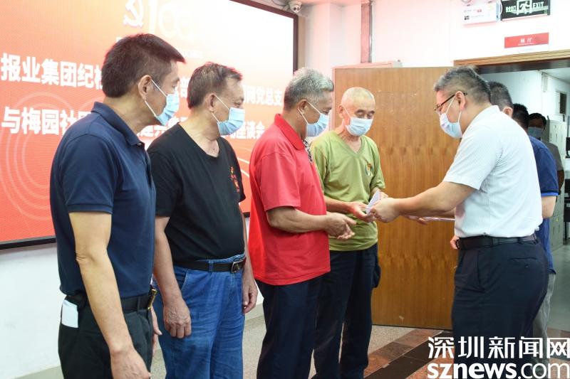 黨課結(jié)束后,陳鵬等代表深圳報業(yè)集團一行對社區(qū)老黨員進行慰問,并向老黨員代表送上慰問金和禮包,隨后,陳鵬向梅園社區(qū)“光榮在黨50年”老黨員們頒發(fā)紀念章,“你們辛苦了,我們要向你們學習,希望你們注意身體,繼續(xù)為社區(qū)做貢獻?!标慁i捧起紀念章,為老黨員們戴上,并對老黨員們送上關(guān)心和祝福。