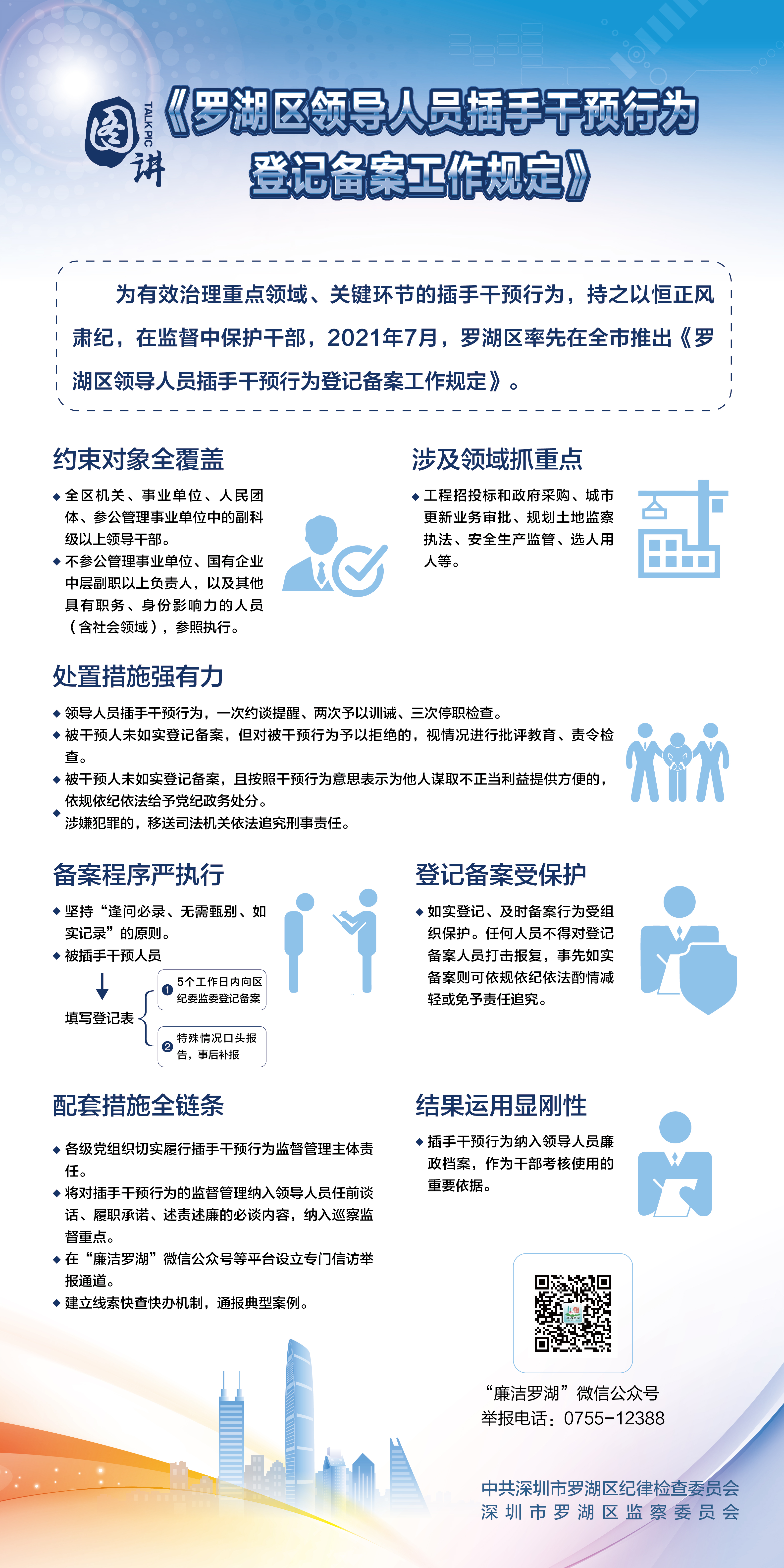 為充分釋放制度活力,羅湖區(qū)紀(jì)委監(jiān)委完善了全鏈條配套措施。插手干預(yù)行為的監(jiān)督管理納入領(lǐng)導(dǎo)人員任前談話、履職承諾、述責(zé)述廉的必談內(nèi)容和巡察監(jiān)督重點(diǎn),插手干預(yù)行為納入領(lǐng)導(dǎo)人員廉政檔案,作為干部考核使用的重要依據(jù)。同時(shí)在“廉潔羅湖”微信公眾號等平臺設(shè)立信訪專欄,建立線索快查快辦機(jī)制,通報(bào)典型案例,讓插手干預(yù)行為暴露在陽光下。