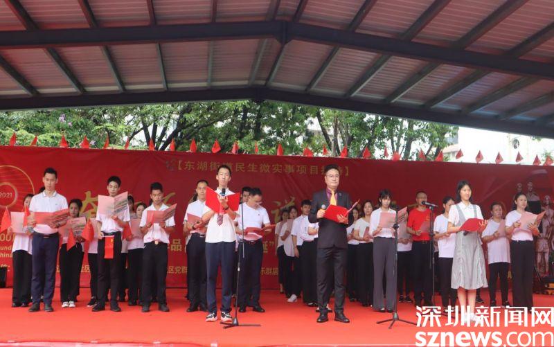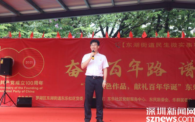 讀特客戶端·深圳新聞網(wǎng)2021年7月30日訊(見習記者 邱婕 通訊員 黃小花)百年征程波瀾壯闊、百年初心歷久彌堅、百年成就催人奮進、百年歌聲唱響今天。7月30日上午,“百幅紅色作品,獻禮百年華誕”東樂社區(qū)建黨100周年慶?;顒釉跂|樂花園文化廣場舉行。東湖街道黨工委副書記、辦事處主任劉慧堅,黨工委副書記、人大工委主任謝統(tǒng)敏,東湖街道二級調(diào)研員、東樂社區(qū)第一書記曾列文,東湖街道辦事處副主任李民,羅湖區(qū)退役軍人事務局副局長何朝陽,東樂社區(qū)黨委書記劉芳,東樂社區(qū)社工與義工及廣大居民朋友400余人參與此次活動。