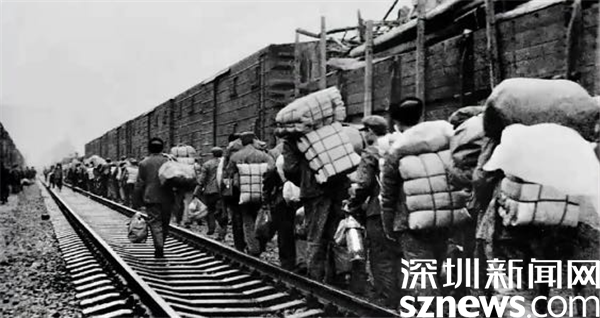 1979年基建工程兵的第一批先遣部隊抵達深圳,下火車時的情景。攝影/周順斌