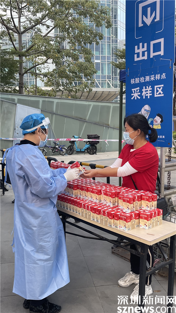 在筍崗街道初心公園核酸檢測點,市民在進行核酸檢測后可以去領取一瓶牛奶。據(jù)了解,這是深圳愛心企業(yè)專門為市民和醫(yī)護人員捐贈的,這一瓶瓶牛奶在深圳的冬天向醫(yī)護人員和市民送上了一份溫暖。