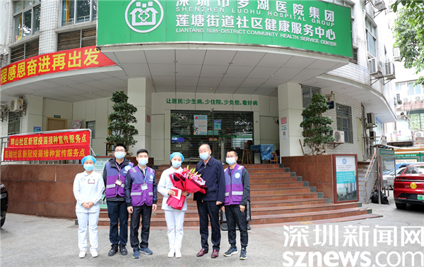 1月13日是王津原定舉行婚禮的日期,她仍然沒有例外地出現(xiàn)在蓮塘社康的采樣隊(duì)伍中。盡管不能出現(xiàn)在婚宴現(xiàn)場,但是并肩作戰(zhàn)的社康同事給王津錄了一個祝福視頻給她祝賀,羅湖醫(yī)院集團(tuán)黨委書記、院長孫喜琢也來到蓮塘社康,向依然堅(jiān)守崗位的新娘王津送上了鮮花和新婚祝福,感謝她的辛勤付出,并對所有在抗疫一線的醫(yī)務(wù)工作者表示感謝,“是你們在守護(hù)羅湖、守護(hù)深圳的安全,你們辛苦了!”