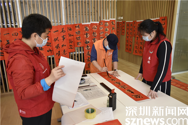 寫春聯(lián),是筆尖上歷久彌香的年味,是記憶里紅紅火火的祝福,是民俗中傳承的瑰寶?;顒?dòng)現(xiàn)場(chǎng),書寫春聯(lián)的劉老師熱情高漲,筆落有序,書寫過程行云流水、一氣呵成,一幅幅空白對(duì)聯(lián)在他們執(zhí)筆揮舞的手中仿佛也有了生氣。而身穿紅色馬甲的義工們則將書寫好的春聯(lián)進(jìn)行晾曬、收集、打包,大家分工合作,井然有序。愿這一副副在巧手下出爐的寓意平安和諧、吉祥如意的春聯(lián),一張張紅彤彤的“?!弊?,給社區(qū)居民帶去春的溫暖、年的祥和。