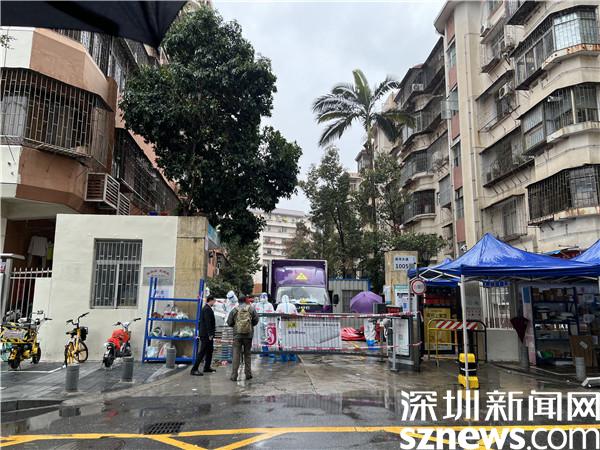 2月22日早上,記者來到處于管控區(qū)域的桂園街道鹿苑小區(qū)。只見身穿防護服的“大白”們來來往往地在門口忙碌著,偶爾有外賣小哥將外賣放在小區(qū)入口的貨架上便離開,雨水打濕了門前拉起的紅色警戒線。鹿丹村社區(qū)黨委書記陳姍姍披著簡單的一次性雨衣,不斷響起的電話,居民的一聲聲詢問,都是她需要盡快處理的各項管控工作。