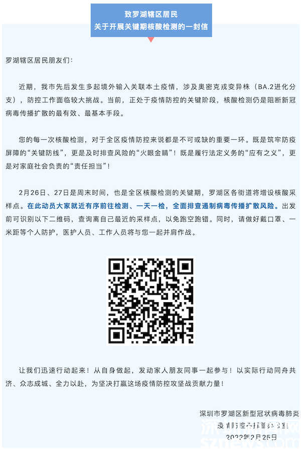 讀特客戶端·深圳新聞網(wǎng)2022年2月26日訊(記者 覃鈺清)2月25日晚,羅湖區(qū)新型冠狀病毒肺炎疫情防控指揮部辦公室發(fā)出《致羅湖轄區(qū)居民關(guān)于開展關(guān)鍵期核酸檢測的一封信》,該信函指出,本周末(2月26日、27日)是全區(qū)核酸檢測的關(guān)鍵期,全區(qū)各街道共設(shè)置200個核酸采樣點,動員轄區(qū)所有居民就近有序前往檢測、一天一檢,全面排查遏制病毒傳播擴散風(fēng)險。26日上午,記者前往羅湖區(qū)桂園街道實地探訪核酸檢測開展情況。