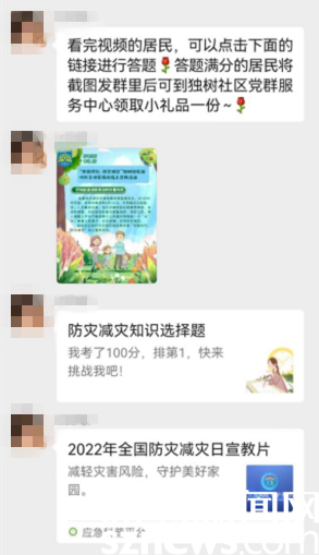 “原來,用滅火器滅火時,滅火器的噴射口應(yīng)該對準(zhǔn)火焰的根部”“電腦著火了,應(yīng)立即拔掉電源后用濕棉被蓋住電腦,而不是給電腦澆水”“震級相差一級,釋放能量相差約32倍”......微信群里,居民群眾一邊觀看學(xué)習(xí)視頻,一邊積極分享學(xué)習(xí)心得、開展熱烈討論。當(dāng)日,社區(qū)居民李女士連續(xù)作答兩次,均未獲得滿分,不由得感嘆:“這些內(nèi)容看似了解,實(shí)操起來還是有點(diǎn)分不清楚,通過學(xué)習(xí)和答題,重新認(rèn)識了防災(zāi)減災(zāi)的重要性,增長了防災(zāi)減災(zāi)知識?!?/span>