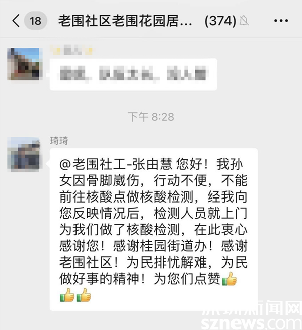 讀特客戶端·深圳新聞網(wǎng)2022年7月14日訊(記者 劉嘉敏 通訊員 楊紀(jì)歐)7月12日晚上8點(diǎn)多,羅湖區(qū)桂園街道老圍社區(qū)的居民琦琦在居民微信群里向社工張由慧說:“您好!我孫女因骨腳崴傷,行動(dòng)不便,不能前往核酸點(diǎn)做核酸檢測(cè),經(jīng)我向您反映情況后,檢測(cè)人員就上門為我們做了核酸檢測(cè),在此衷心感謝您!感謝桂園街道辦!感謝老圍社區(qū)!為民排憂解難,為民做好事的精神!為你們點(diǎn)贊?!?/p>