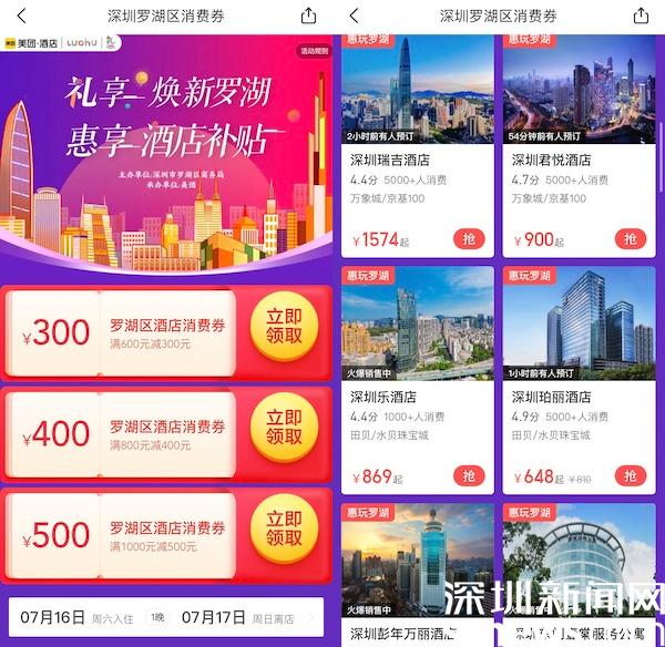 讀特客戶端·深圳新聞網(wǎng)2022年7月16日訊(記者 覃鈺清)7月16日,羅湖區(qū)會同羅湖區(qū)酒店行業(yè)協(xié)會、美團(tuán)推出“禮享煥新羅湖,惠享酒店補(bǔ)貼”活動,投入33萬扶持資金,用于支持酒店、住宿消費。消費者可在美團(tuán)APP搜索“羅湖消費券”、“羅湖酒店消費券”等關(guān)鍵詞進(jìn)入活動頁面,點擊“領(lǐng)取”按鈕即可獲得。本次優(yōu)惠額度包括:滿1000元減500元、滿800元減400元、滿600元減300元,最高五折優(yōu)惠,可在羅湖轄區(qū)內(nèi)40余家酒店使用。