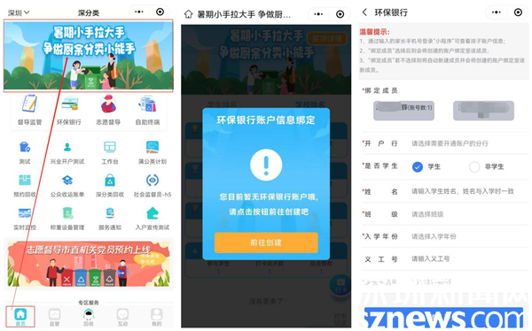 學(xué)生及家長(zhǎng)可通過(guò)“深分類”小程序首頁(yè)主題活動(dòng)入口進(jìn)入活動(dòng)。在參與活動(dòng)之前,學(xué)生所在學(xué)校需開(kāi)通環(huán)保銀行支行,學(xué)生需注冊(cè)所在學(xué)校支行的環(huán)保銀行賬戶,并在活動(dòng)中進(jìn)行賬戶信息綁定、上傳參與學(xué)生照片才可參與后續(xù)打卡集贊活動(dòng)。