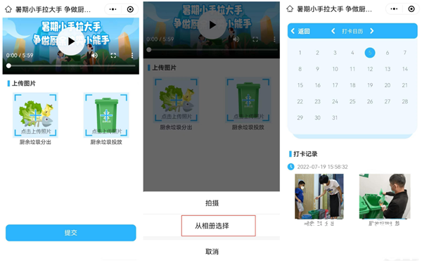 需要注意的是,學(xué)生在上傳照片時(shí),須上傳每日廚余分類和廚余投放照片,不可重復(fù)使用同一張照片進(jìn)行打卡,當(dāng)日多次上傳照片僅記錄打卡簽到1次;此外,如上傳與廚余垃圾分類無(wú)關(guān)的照片,系統(tǒng)將自動(dòng)作廢當(dāng)次打卡,判定該次打卡無(wú)效。