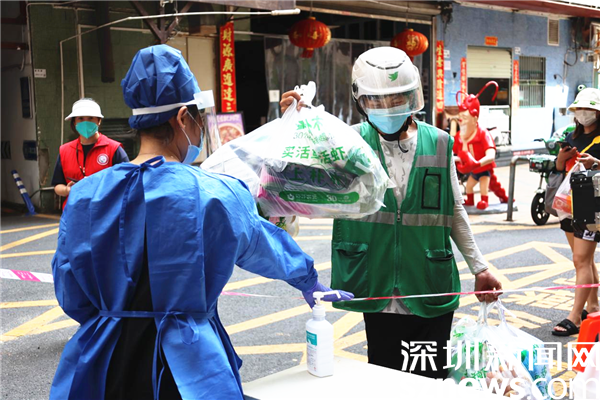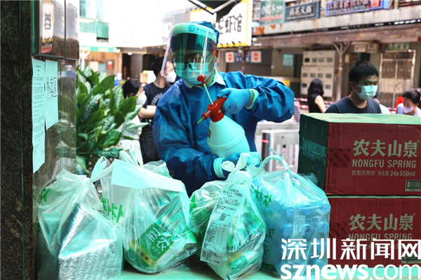 8月29日下午,深圳新聞網(wǎng)記者來(lái)到羅湖區(qū)南湖街道文錦社區(qū)凱悅?cè)A庭,只見小區(qū)居民正保持著一米距離有序地進(jìn)行核酸檢測(cè),身穿防護(hù)服的“藍(lán)墩墩”在一旁忙碌著。記者在現(xiàn)場(chǎng)看到偶有“騎士”將居民在網(wǎng)上商城所下單的物資像傳送接力棒一樣交到“藍(lán)墩墩”的手上,“藍(lán)墩墩”接過(guò)之后,立即進(jìn)行全方位的消殺工作。