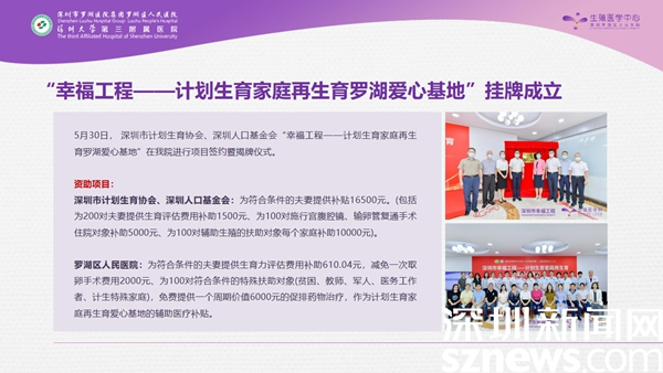 今年初,深圳市計劃生育協(xié)會、人口基金會就創(chuàng)建了一項“幸福工程”,旨在為計劃生育家庭再生育提供幫助。今年5月30日,第一個幸福工程基地就選擇坐落于羅湖醫(yī)院,項目為符合條件的夫妻提供總額高達(dá)16500元的醫(yī)療補貼,同時,羅湖醫(yī)院還給予相應(yīng)的醫(yī)療減免,包括手術(shù)及藥品費用的配套補貼。為居民再生育提供了很好的幫助,大大降低了經(jīng)濟壓力,讓更多的家庭愿意再生育。