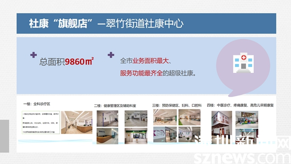 2021年3月,全市業(yè)務(wù)面積最大、服務(wù)功能最齊全的羅湖醫(yī)院集團翠竹街道社康中心投入使用??偯娣e9860平方米共有4層,分設(shè)不同功能區(qū)。一樓為診療區(qū),涵蓋全科診療區(qū)、專家工作室、醫(yī)學(xué)影像檢查區(qū)等;二樓為健康管理區(qū),為居民提供全周期的健康體檢及檢后健康管理服務(wù),還設(shè)有超聲、檢驗、DR等科室;三樓為預(yù)防保健區(qū),口腔科、婦科,四樓為高危兒早期康復(fù)中心、名中醫(yī)館、中醫(yī)康復(fù)理療區(qū)。