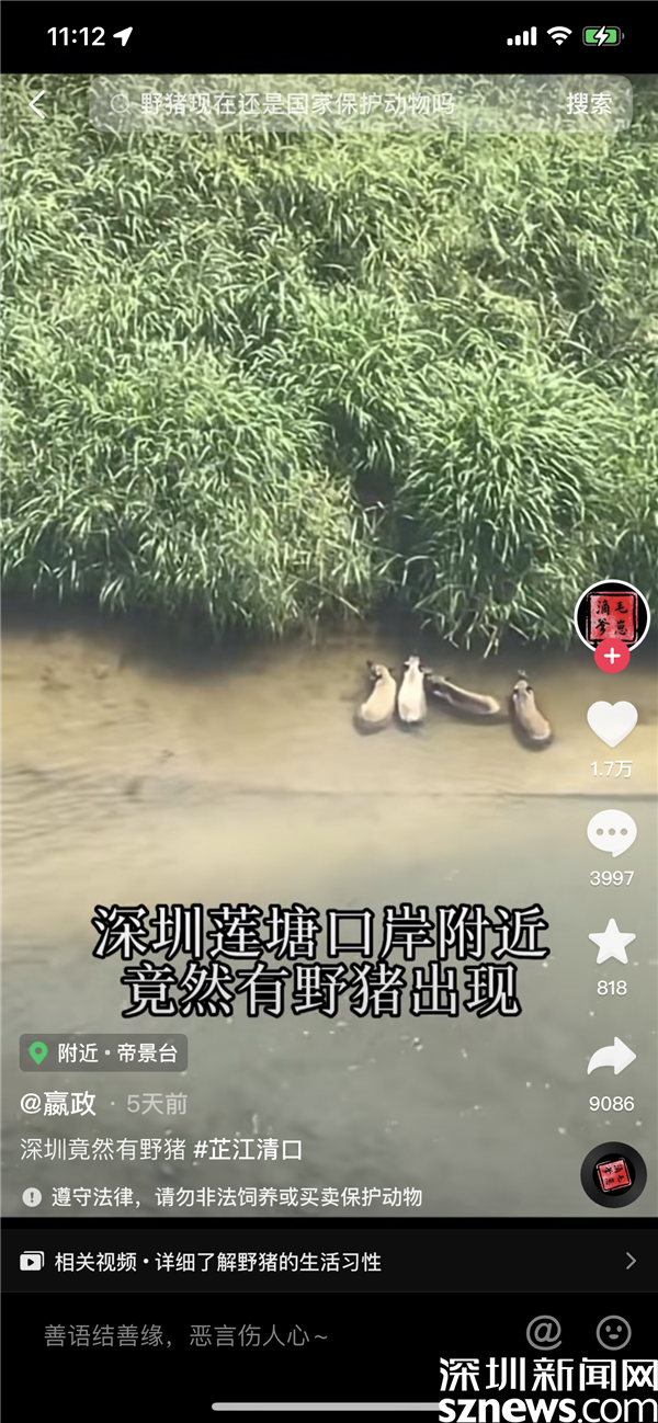 近日,抖音視頻“深圳蓮塘口岸附近有野豬出沒”引起了市民的關(guān)注。