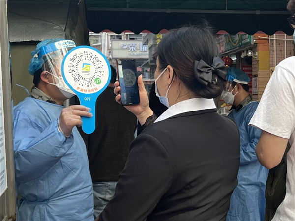 在羅湖新村北門出口,市民進入新村需要先掃描場所碼進行入場登記,隨后在“電子哨兵”上掃描健康碼。如市民是綠碼,該設備上會顯示“綠碼請通行”,并同步顯示體溫、核酸檢測、新冠疫苗接種等信息。