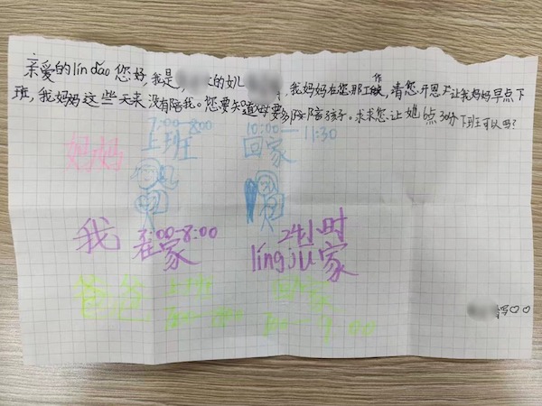 “親愛的lín dǎo您好……我媽媽在您那工作,這些天都沒能陪我,請你讓她6點(diǎn)30分下班可以嗎?”,1月13日,羅湖區(qū)南湖街道羅湖社區(qū)黨委書記姜德榮收到了一封特別的來信。這封信來自社區(qū)工作人員彭女士可愛的女兒,信上的內(nèi)容圖文并茂,表達(dá)了一個10歲小女孩的小心愿,希望媽媽可以早點(diǎn)下班,回家陪她。