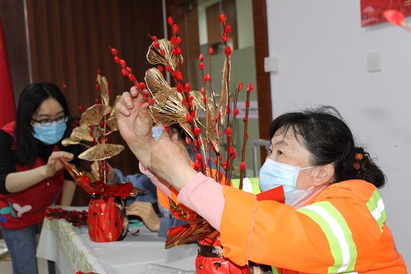 2月4日,適逢農歷小年,社工以邀請函的形式,邀請了轄區(qū)企業(yè)員工、城中村保潔員,以及社區(qū)高齡空巢老人、獨居老人等,齊齊插年花。