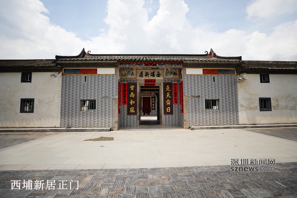 2017年8月的一天,深圳新聞網(wǎng)記者探訪西埔新居,在龍崗“三館一城(公共藝術(shù)館、科技館、青少年宮、圖書館)”的工地包圍中,我們從萬科天譽學校的側(cè)門,走過一段小路,終于看到一半月形的池塘,找到了西埔新居。一位老奶奶正在西埔新居前的空地散步,她指給我們進入新居的入口,正門兩側(cè)的對聯(lián)“堯天舜日,甘雨和風”頗具古風,又有天下情懷。