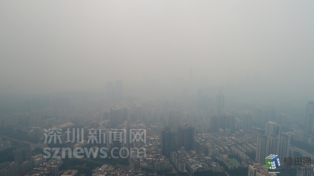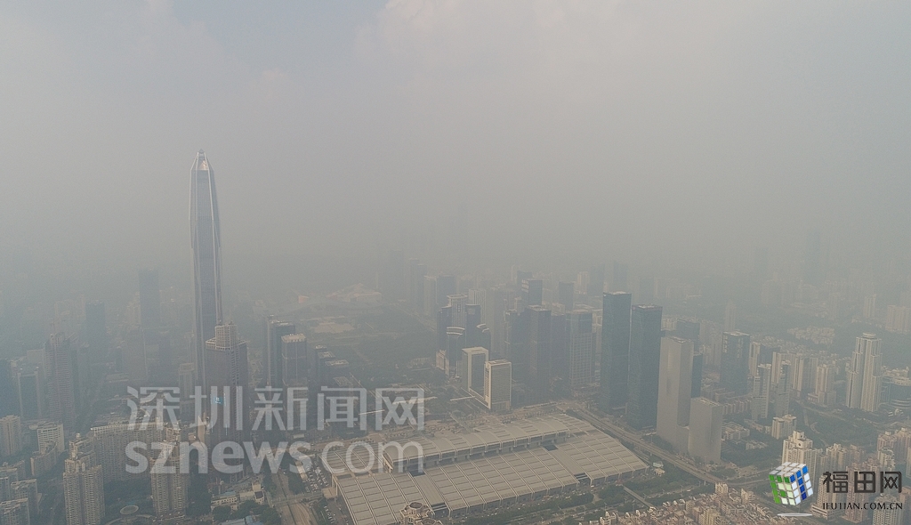 無人機(jī)在數(shù)百米高空俯瞰灰霾籠罩下的深圳中心區(qū),大半個(gè)城區(qū)都看不清楚。