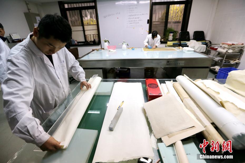 “文物醫(yī)生”在“書(shū)畫(huà)文物修復(fù)室”內(nèi)工作。中新社記者 張遠(yuǎn) 攝