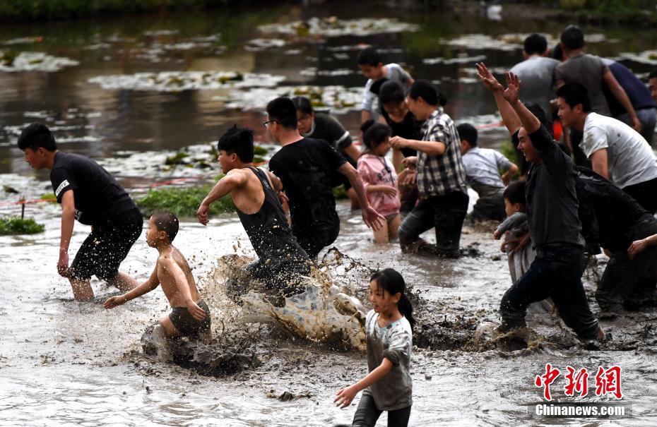 3月17日,福建省龍巖市連城縣莒溪鎮(zhèn)璧洲古村落內(nèi),一場“抓魚鬧春田”的活動(dòng)吸引了許多市民前來參與。圖為民眾在泥塘的渾水中抓魚。中新社記者 張斌 攝